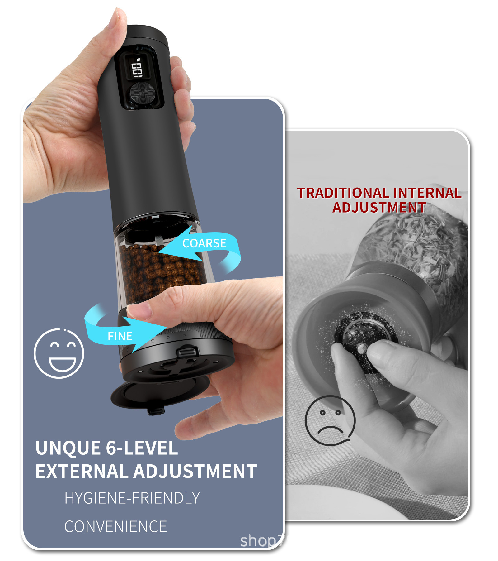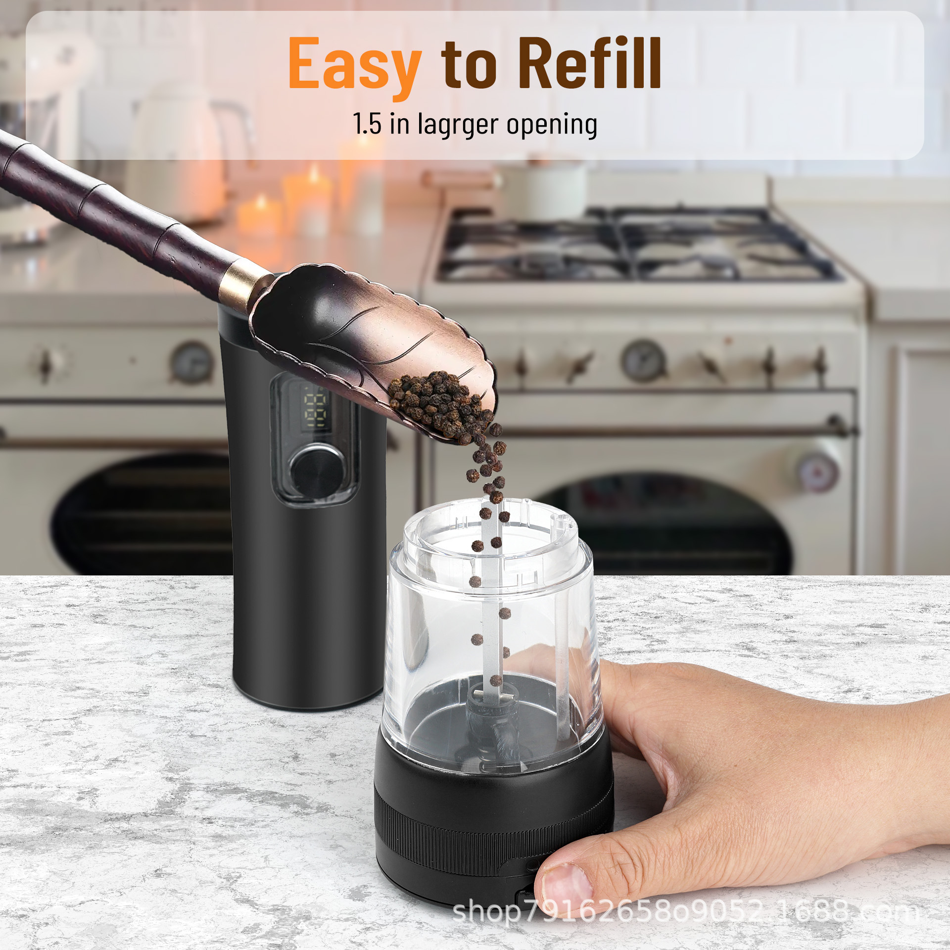 Electric Pepper Grinder—a sleek, battery-powered mill featuring adjustable ceramic grinding blades for precise coarseness control.